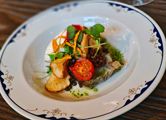 - Maa-artisokkaterriiniä, marinoituja beluga-linssejä, hapankermaa ja friteerattua maa-artisokkaa