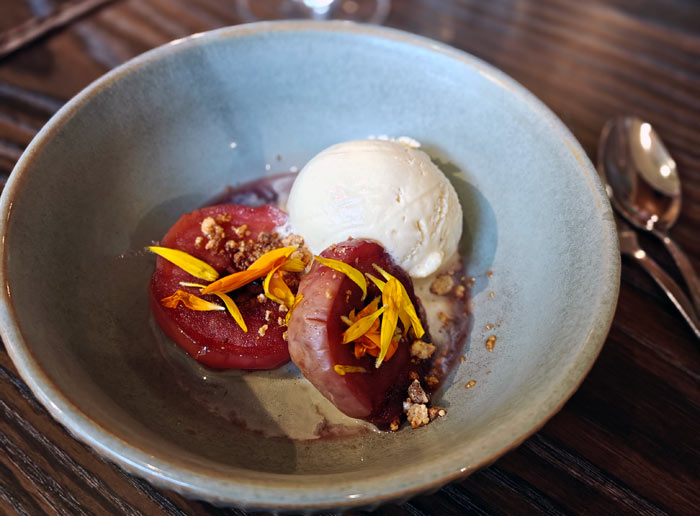 Jälkiruokana maistamme joulumausteisesti haudutettua omenaa, mutta shown varastaa kuitenkin herkullinen itse tehty mesiangervojäätelö. Aistin jälkiruoissa on usein jäätelöä, enkä ihmettele, koska heidän tekemänään sana jäätelö saa uuden merkityksen. Suosittelen maistamaan!
