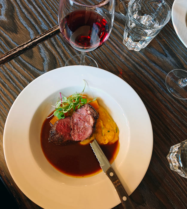 - Villisorsanrintaa, tummaa tyrnikastiketta, kurpitsapikkelsiä ja kurpitsalla maustettua polentaa